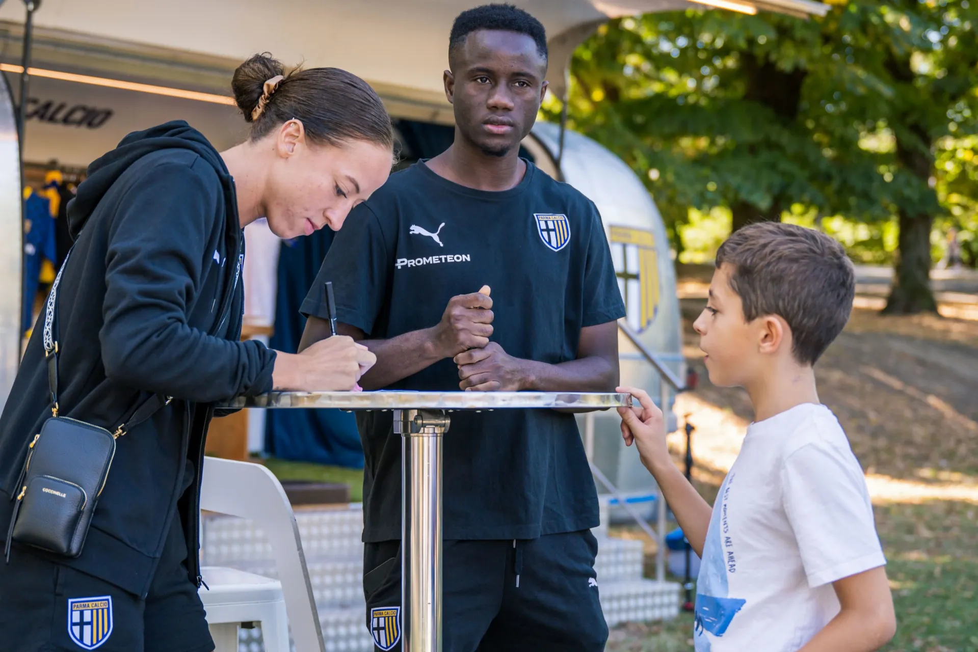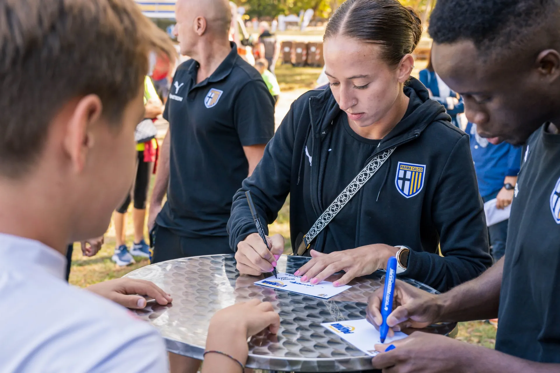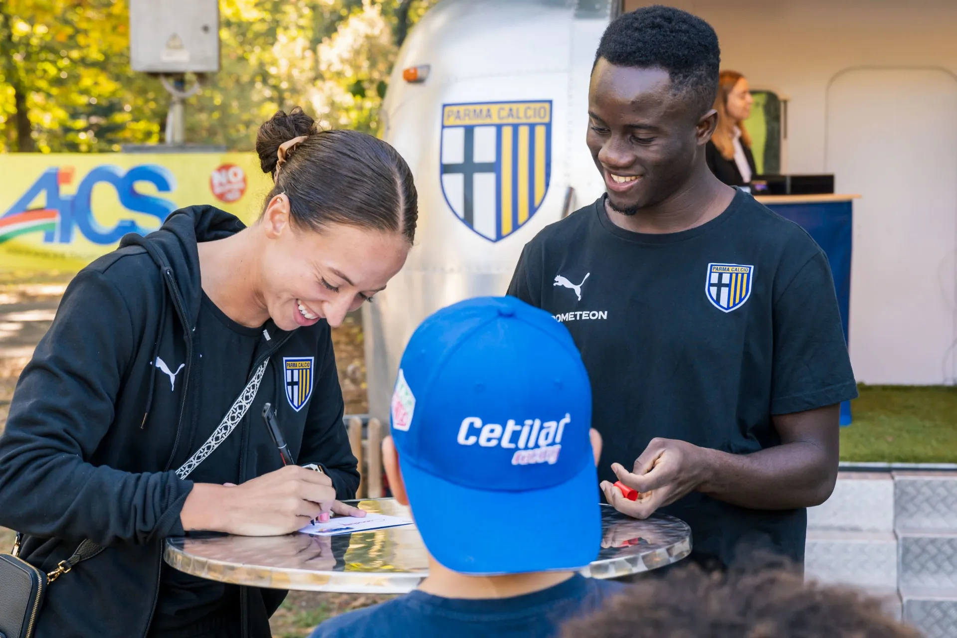 La bella sorpresa è stata quando, nella tarda mattinata, Drissa Camara e Antoinette Jewel Williams, in rappresentanza della Prima Squadra Maschile e Femminile, si sono presentati al Parco Cittadella per firmare una sessione di autografi e scattare fotografie e selfie. Sia Drissa che Antoinette hanno ricevuto i saluti istituzionali dell’Assessore allo Sport del Comune di Parma, Marco Bosi. A tutti i partecipanti sono stati regalati dei prodotti by Cetilar (polsino, cappellino e dei campioni omaggio), una bandiera da portare ed esibire durante Parma-Bari di mercoledì e, naturalmente, un biglietto omaggio per un bambino e il suo accompagnatore che proprio mercoledì sera assisterà alla partita della squadra di Pecchia contro quella di Mignani al Tardini.